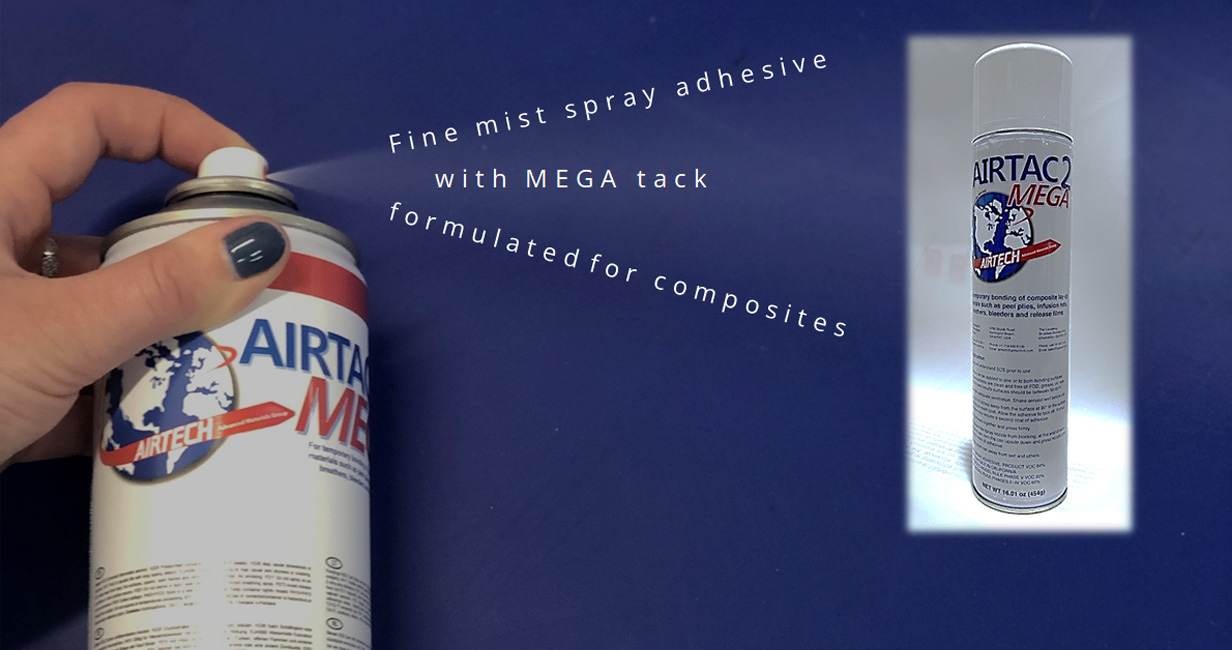 Airtac 2 Mega is a fine mist spray adhesive, with very high tack, designed for temporary bonding. Airtac 2 Mega can be used to hold dry materials on contours and vertical surfaces. This product is ideally suited to resin infusion applications for holding fabrics, peel plies, release films, and infusion mesh in place until the vacuum bag is secured. Airtac 2 Mega is a fine mist.